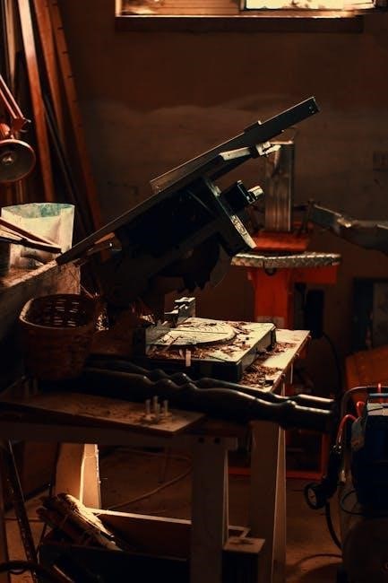 Blade issues are common and require immediate attention for safe operation. Dull or damaged blades can cause uneven cuts, vibrations, and potential accidents. Regularly inspect the blade for signs of wear, such as chipped or bent teeth. If the blade is misaligned, adjust it according to the manual to ensure proper tracking. A wobbling blade may indicate improper installation or a faulty arbor. Always use the correct blade type for your material to prevent overheating or binding. Sharpen or replace blades as needed, following safety guidelines. Never operate the saw with a loose or damaged blade, as this can lead to serious injury. Consult the manual for blade removal and installation procedures. Proper blade maintenance ensures accurate cuts and extends the tool’s lifespan. Addressing blade issues promptly helps maintain performance and safety.